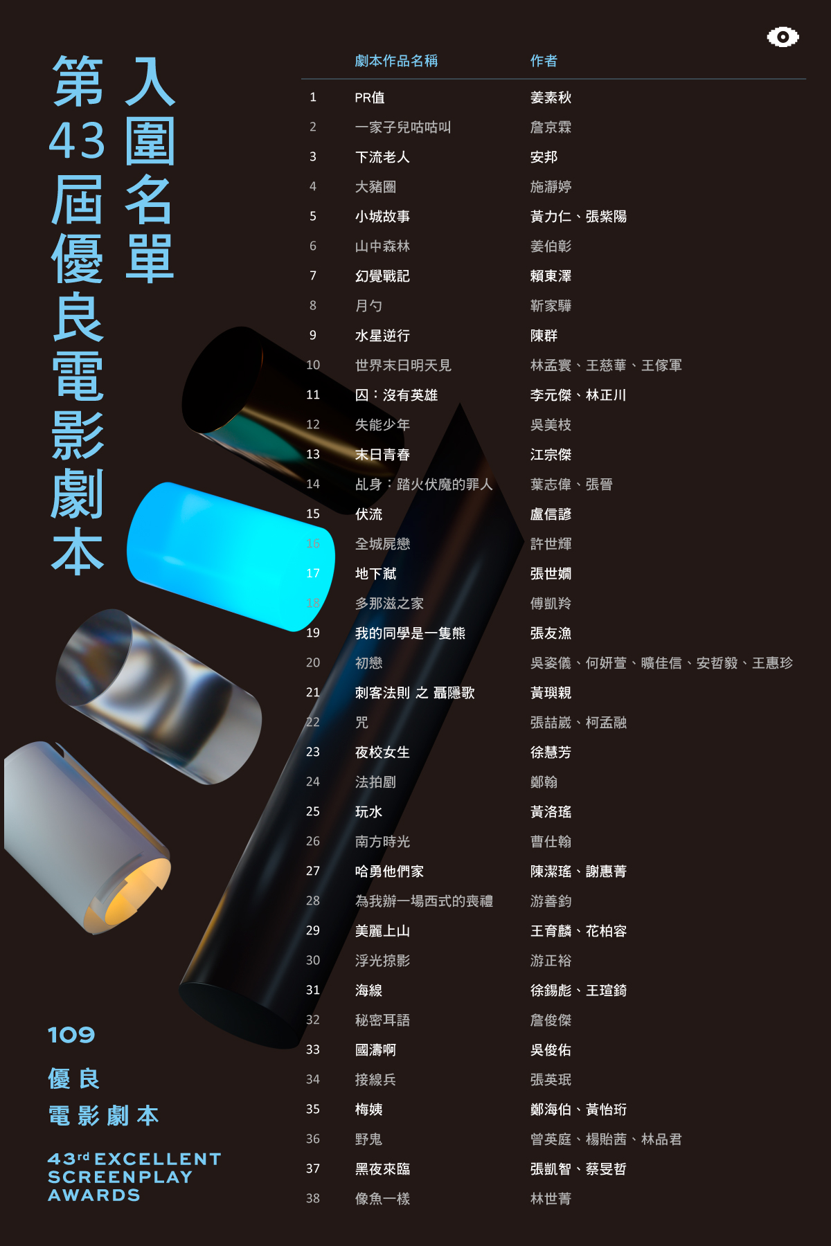 由文化部影視及流行音樂產業局主辦,台北金馬影展執行委員會執行的「第43屆優良電影劇本」於今日(8/30)公布入圍名單,本屆參賽劇本數量高達450件(改編21件,原創429件),評審共選出38件入圍作品,詳細名單請見下方列表,並將角逐首獎1名、特優6名、優等獎13名,總獎金高達454萬,得獎名單將於11月24日揭曉。